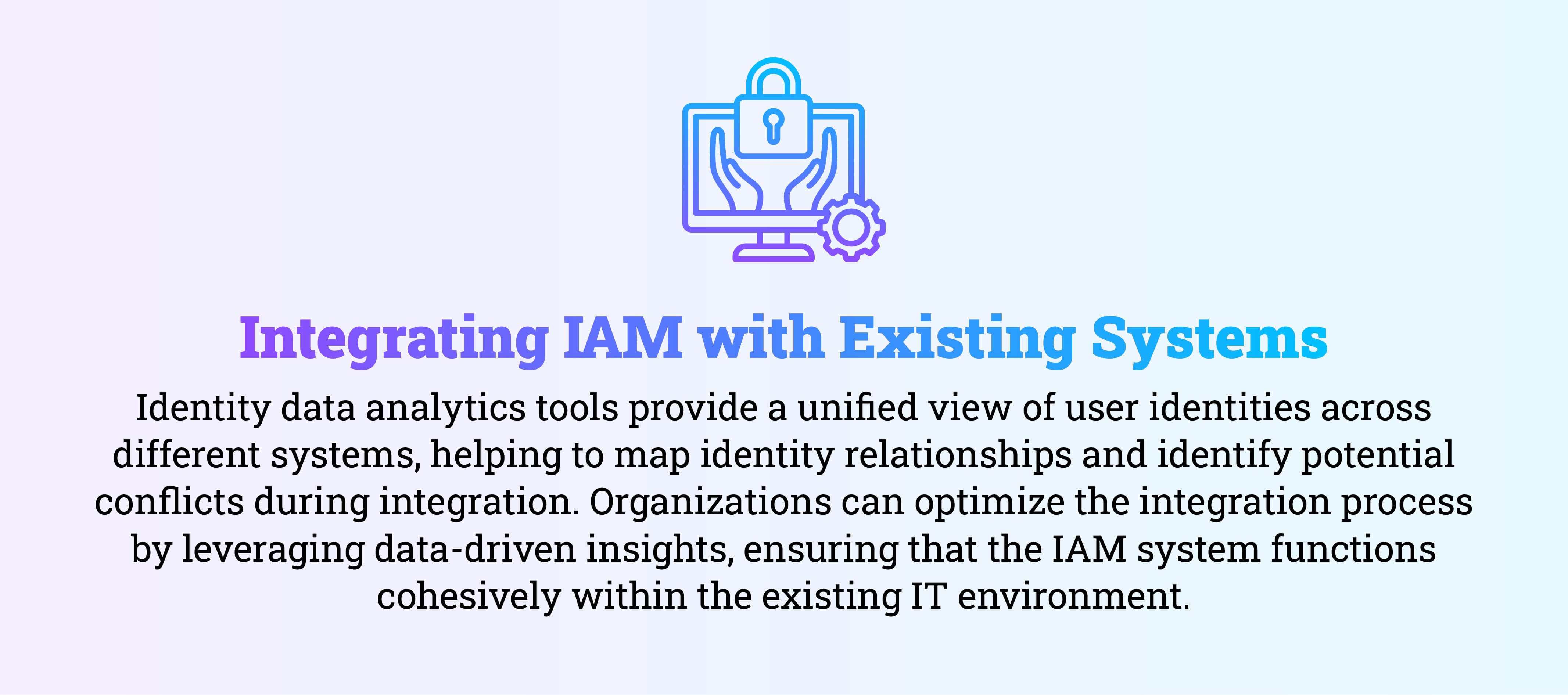 Identity data analytics tools provide a unified view of user identities across different systems, helping to map identity relationships and identify potential conflicts during integration. Organizations can optimize the integration process by leveraging data-driven insights, ensuring that the IAM system functions cohesively within the existing IT environment.