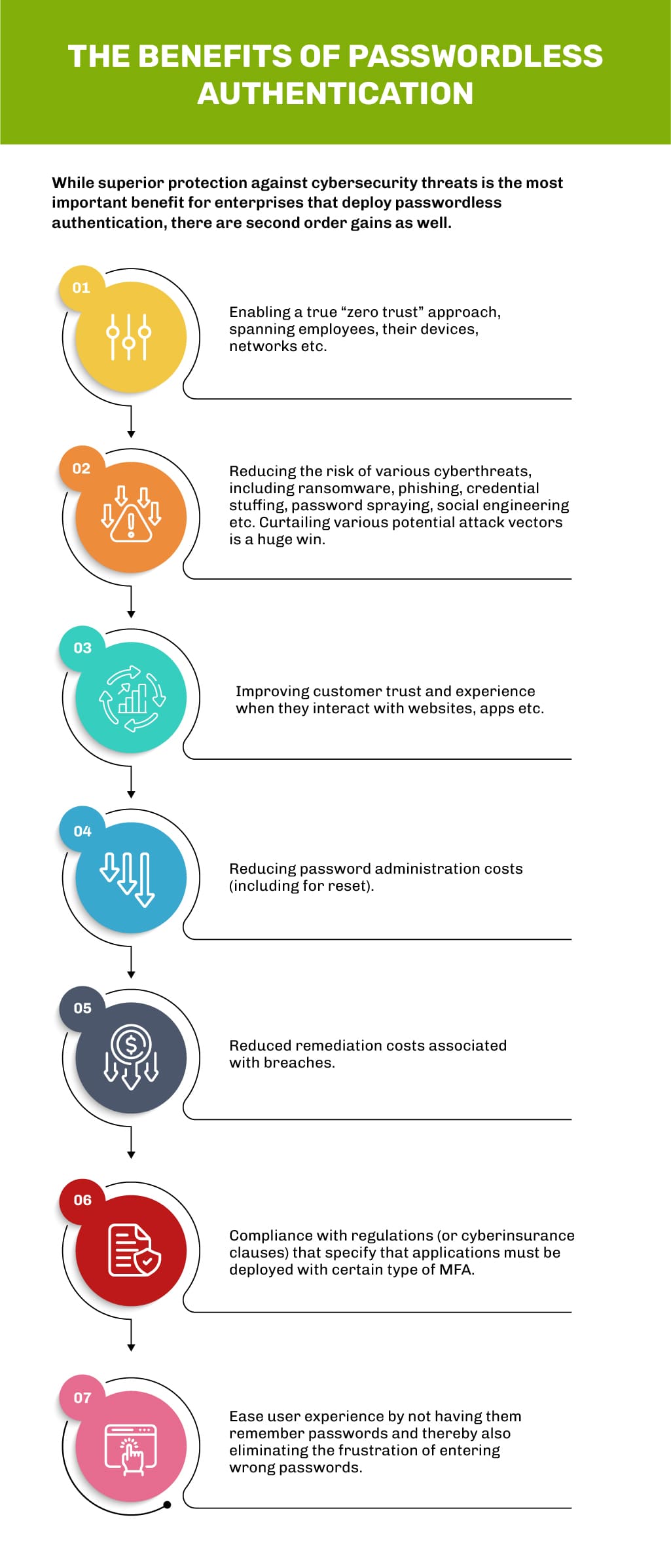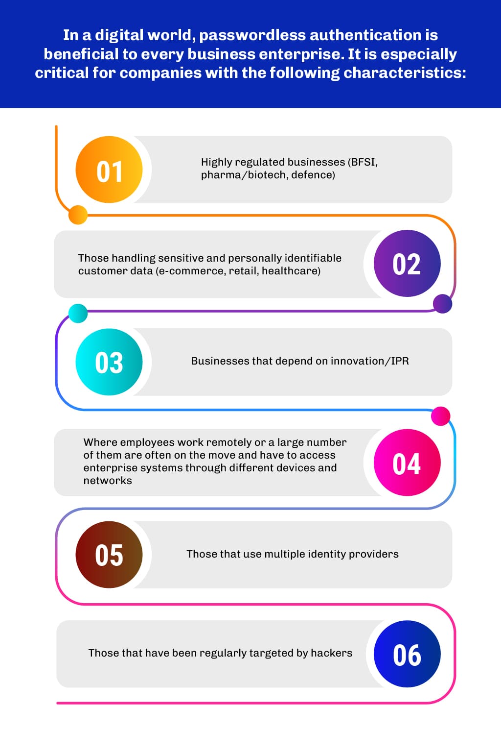To paraphrase Stephen Covey, when you pick up one end of a stick, you pick up the other end as well. This prescient observation applies to digitalization as well. Across industries, as B2B, B2C and D2C enterprises embrace higher levels of digital transformation, the quantum and scope of security risks associated with “digital” also increase. For decades, passwords have been used to authenticate user identity prior to allowing them access to various applications and software systems. Employees, business partners, customers, and other service providers all need to be authenticated.